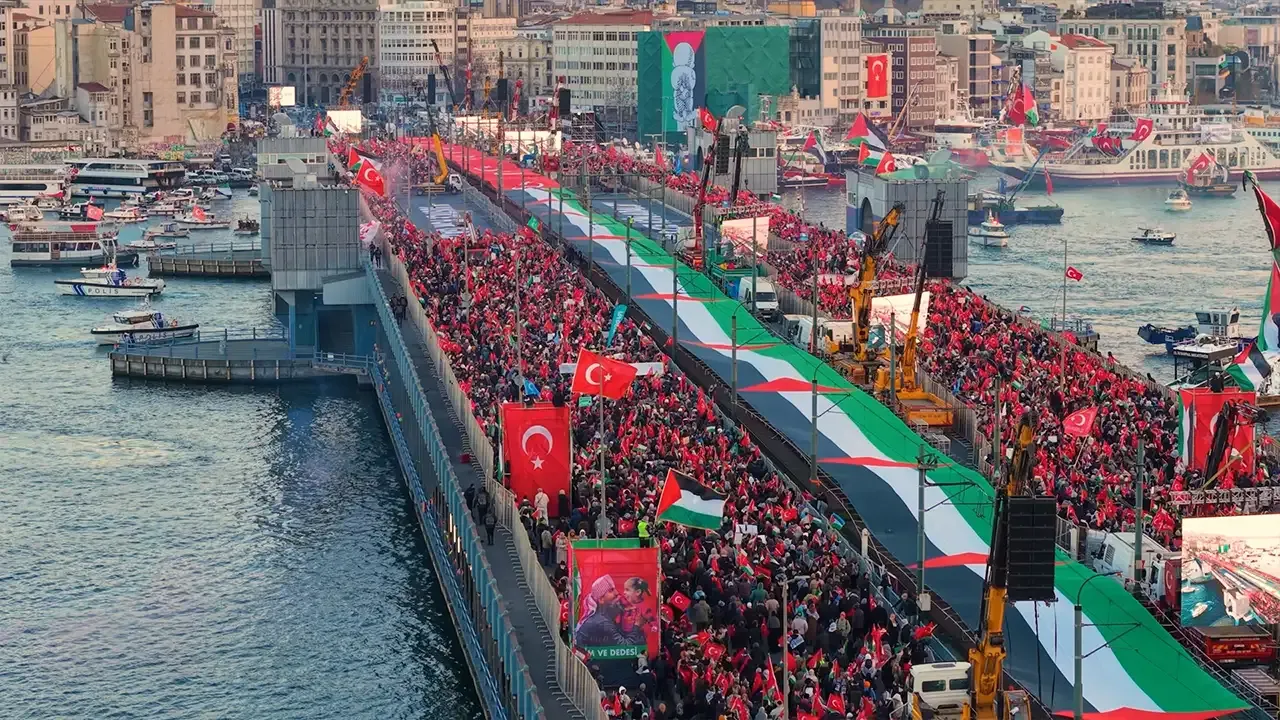 Filistin'e destek için Galata Köprüsü'nde yılın ilk gününde düzenlenen yürüyüşe, yaklaşık 520 bin kişi katıldı.