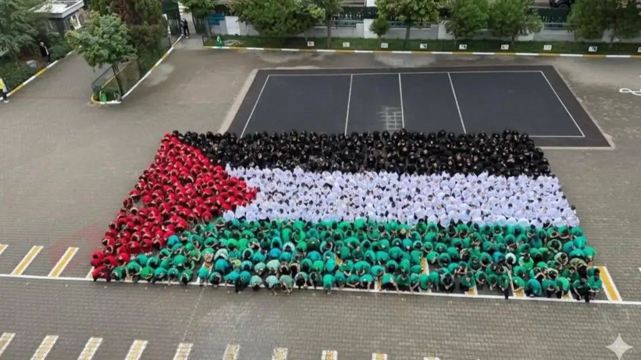 Etkinlik kapsamında öğrenciler, Filistin bayrağının renklerini taşıyan kıyafetler giyerek barış, kardeşlik ve dayanışma mesajı verdi. El ele vererek oluşturulan dev Filistin bayrağı, okul bahçesini adeta bir barış sahnesine dönüştürdü.