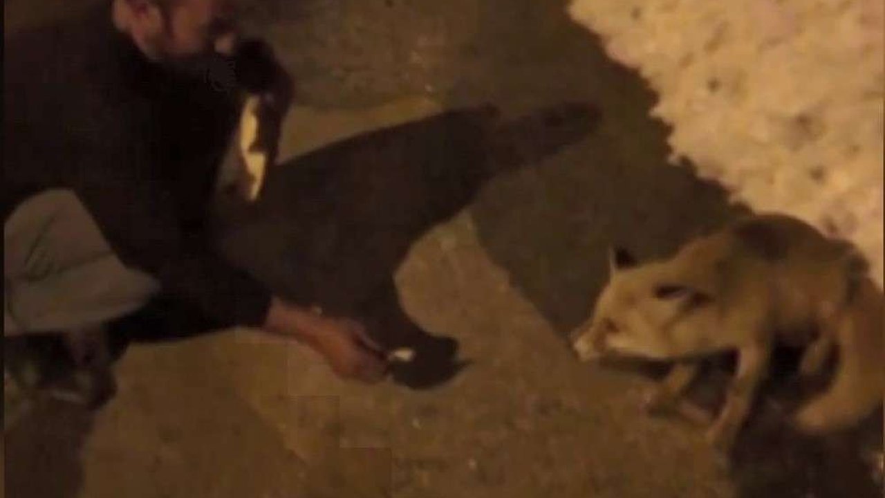 Erzurum’da bir vatandaş soğuk havada yiyecek bulmakta zorlanan tilkiyi elleriyle besledi.