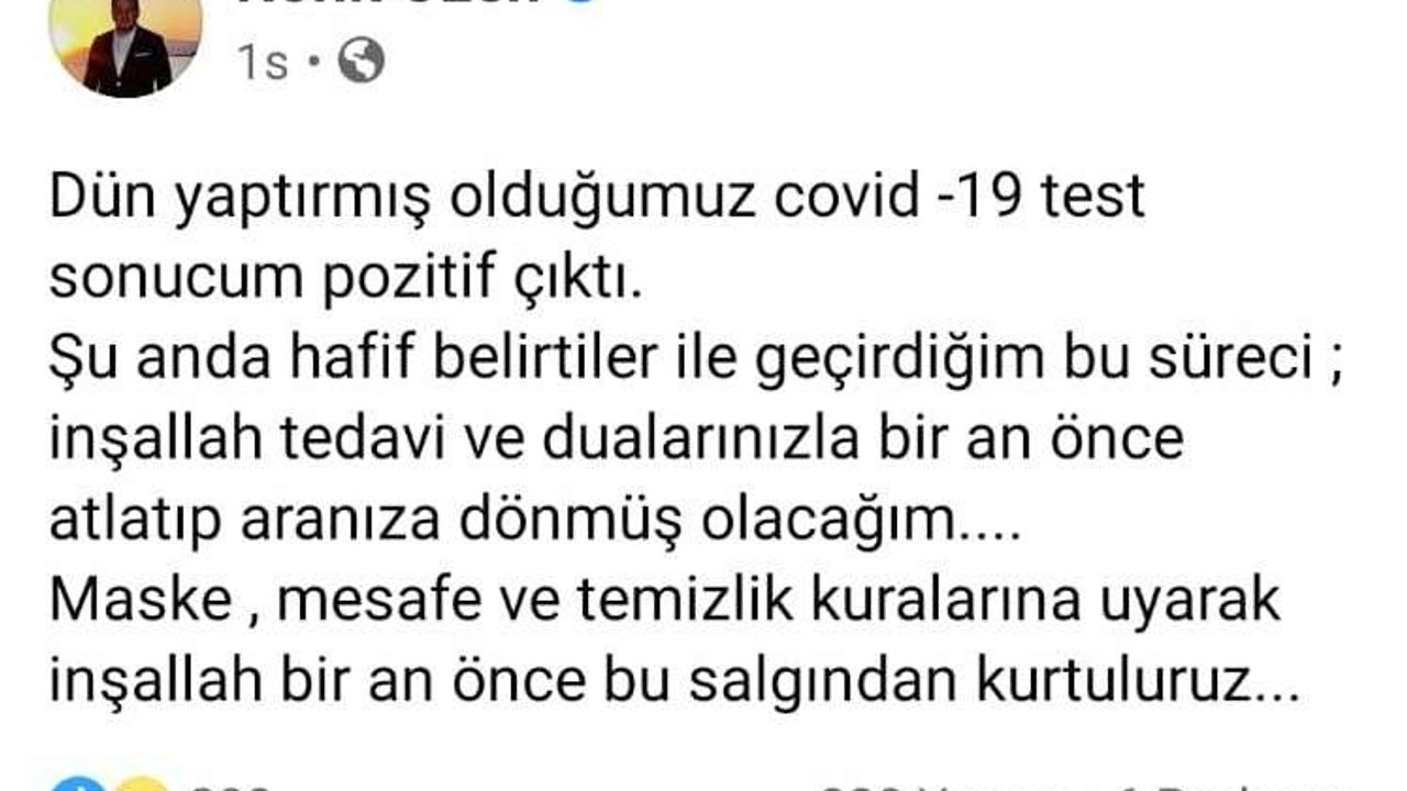 AK Parti Bursa Milletvekili Refik Özen sosyal medya hesabından yaptığı paylaşımda, korona virüs testinin pozitif çıktığını belirtti. Özen açıklamasında, 'Dün yaptırmış olduğum covid-19 test sonucu pozitif çıkmıştır. Şu anda hafif belirtilerle geçirdiğim bu süreci, inşallah tedavi ve dualarınızla bir an önce atlatıp aranıza dönmüş olacağım. Maske, mesafe ve temizlik kurallarına uyarak inşallah bu salgından bir an önce kurtuluruz' dedi.