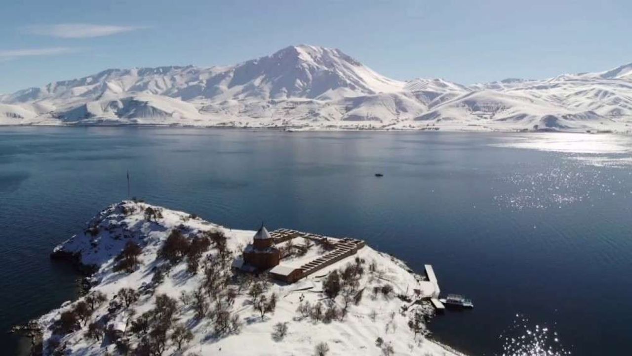 Van’ın önemli turizm merkezleri arasında yerini alan ve her mevsim gelen konuklarına farklı güzellikler sunan Akdamar Adası, kar yağışıyla birlikte beyaza büründü. Kar yağışının ardından beyaz örtüyle bezenen ada, yaz aylarında olduğu gibi kış mevsiminde de ziyaretçilerini büyülüyor. Yerli ve yabancı turistlerin uğrak yeri olan Akdamar Adası’nın beyaza bürünmüş hali, Van Gölü’nün turkuaz mavisiyle birleşince ortaya seyrine doyumsuz manzaralar çıktı.
