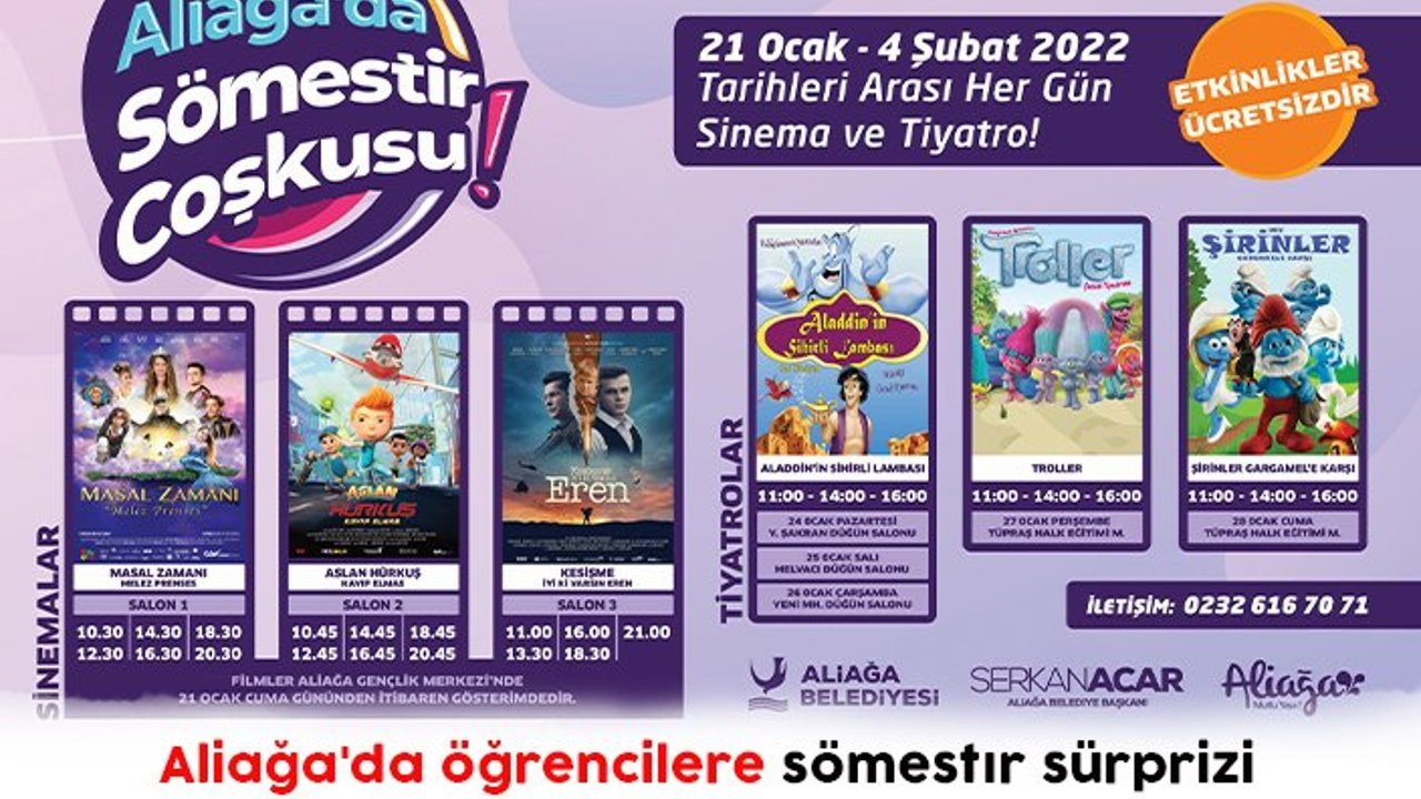Aliağa Gençlik Merkezi Sinema Salonu’nda 21 Ocak 2022 Cuma günü başlayacak sinema şöleni 4 Şubat 2022 Cuma günü sona erecek. Öğrenciler sinema keyfini iki hafta boyunca her gün 10.30 – 21.00 saatleri arasında gösterime sunulacak; Masal Zamanı “Melez Prenses”, Aslan Hürkuş Kayıp Elmas (Animasyon) ve Kesişme “İyi ki Varsın Eren” isimli filmlerle yaşayacak.