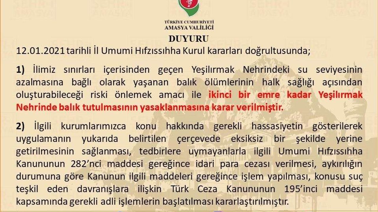 'İlimiz sınırları içerisinden geçen Yeşilırmak Nehri’ndeki su seviyesinin azalmasına bağlı olarak yaşanan balık ölümlerinin halk sağlığı açısından oluşturabileceği riski önlemek amacı ile ikinci bir emre kadar Yeşilırmak Nehri’nde balık tutulmasının yasaklanmasına karar verilmiştir. İlgili kurumlarımızca konu hakkında gerekli hassasiyetin gösterilerek uygulamanın yukarıda belirtilen çerçevede eksiksiz bir şekilde yerine getirilmesinin sağlanmasına, tedbirlere uymayanlarla ilgili Umumi Hıfzıssıhha Kanunu’nun 282’nci maddesi gereğince idari para cezası verilmesine, aykırılığın durumuna göre Kanunun ilgili maddeleri gereğince işlem yapılmasına, konusu suç teşkil eden davranışlara ilişkin Türk Ceza Kanunu’nun 195’inci maddesi kapsamında gerekli adli işlemlerin başlatılmasına oy birliği ile karar verilmiştir.”