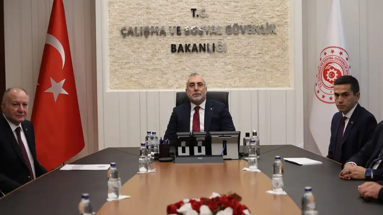 Çalışma ve Sosyal Güvenlik Bakanı Vedat Işıkhan nezaretinde bakanlıkta gerçekleştirilen komisyon toplantısı öncesi Türk-İş Genel Başkan Yardımcısı Ramazan Ağar, Bakan Işıkhan ve işvereni temsil eden Türkiye İşveren Sendikaları Konfederasyonu (TİSK) Yönetim Kurulu Başkanı Özgür Burak Akkol'un da aralarında bulunduğu komisyon üyeleriyle bir araya geldi.