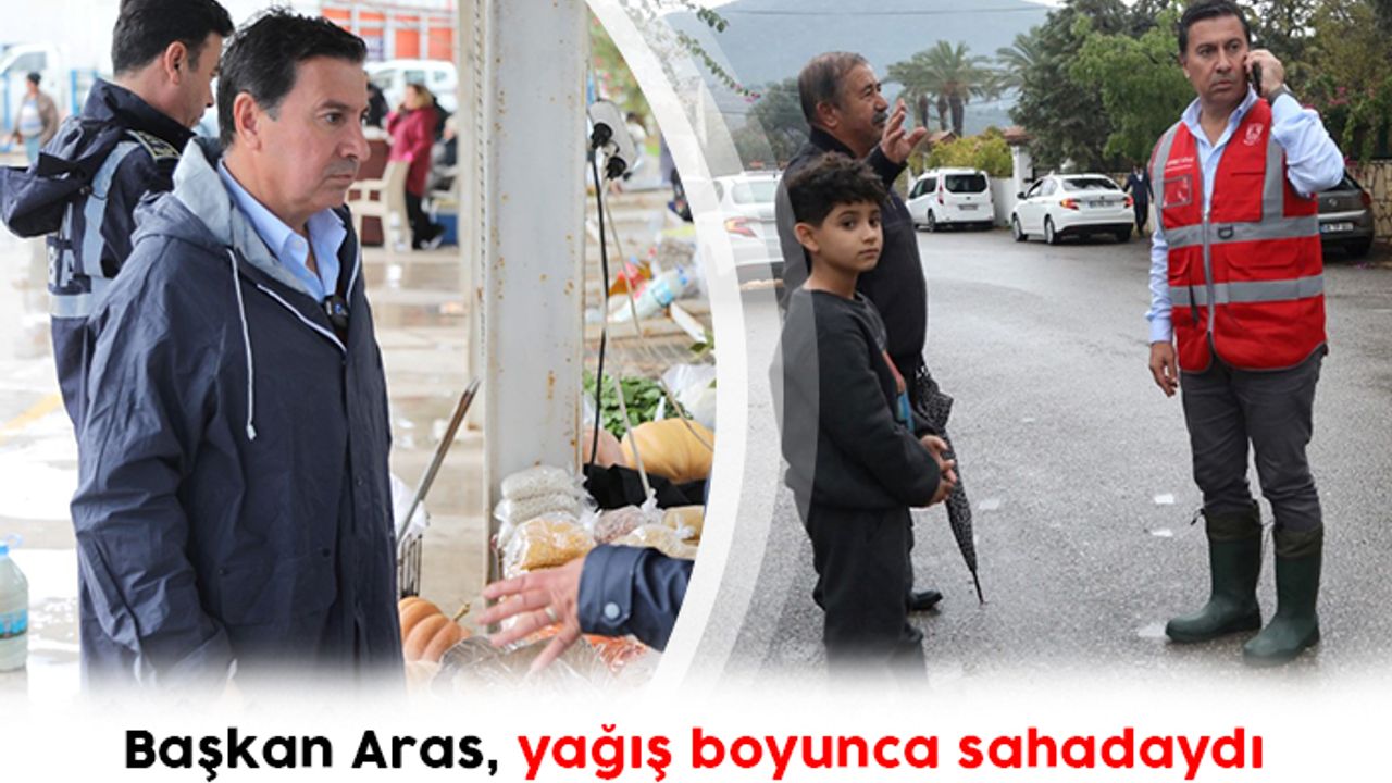 23 Kasım Çarşamba öğlen saatlerinde başlayan şiddetli fırtına ve sağanak yağışta Zabıta Müdürlüğü, Temizlik İşleri, Halkla İlişkiler Birimi, Park ve Bahçeler, Destek Hizmetleri ve Fen İşleri ekiplerinin koordinasyonlu olarak yaptığı çalışmaları yerinde inceleyen Başkan Aras, vatandaşların ve esnafın sorunlarını çözmek için belediye birimlerine talimat verdi.