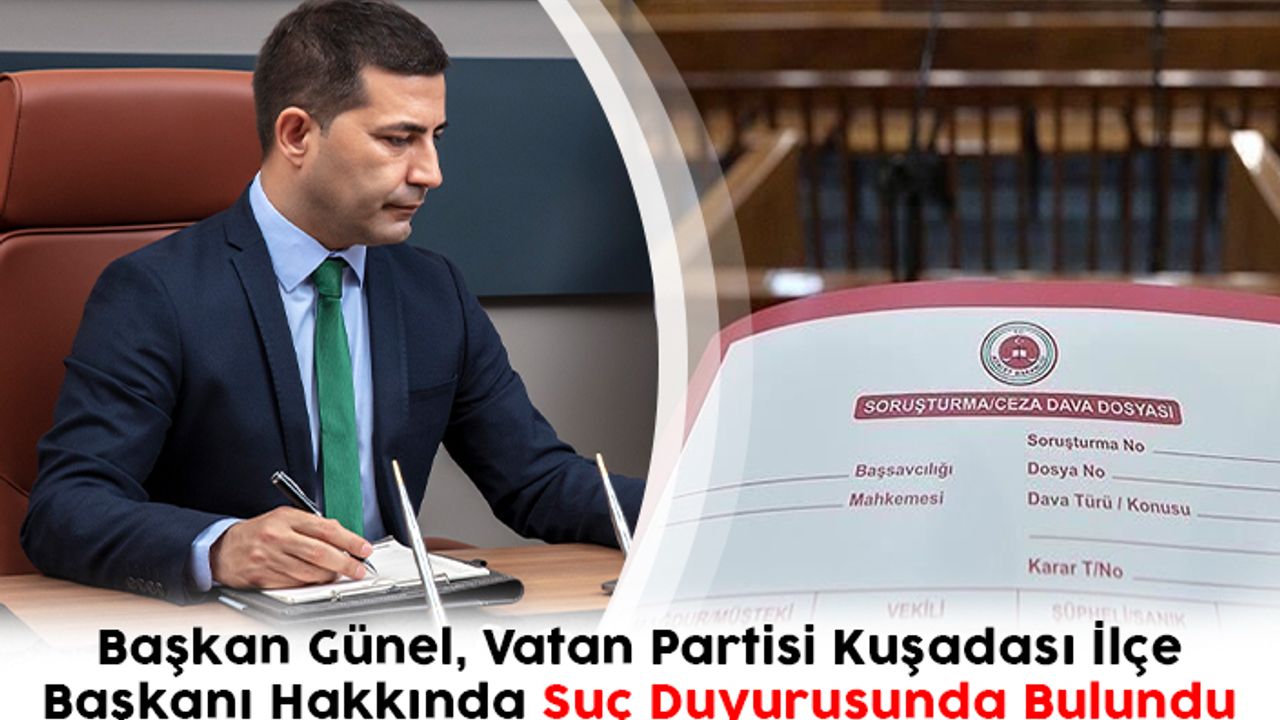 Başkan Ömer Günel, Vatan Partisi Kuşadası İlçe Örgütü tarafından Kuşadası Belediyesi Hizmet Binası önünde yapılan basın açıklamasını yargıya taşıdı. Başkan Ömer Günel, Vatan Partisi İlçe Başkanı Can Karabalcı’nın gerçek dışı beyanlara dayalı, iftira ve hakaret niteliğindeki basın açıklaması hakkında, TCK’nın 125’inci ve 267’inci maddelerine dayanarak Kuşadası Cumhuriyet Savcılığına suç duyurusunda bulundu.