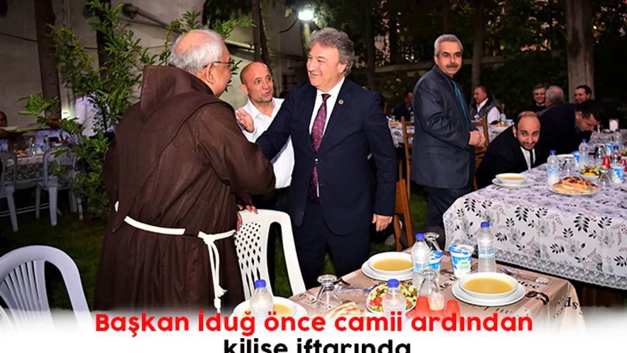 Süvari Caddesi üzerindeki Yeni Camii’nin avlusunda düzenlenen iftarda kazanın başına geçip sıcak yemek dağıtan Başkan İduğ, iftara katılan vatandaşlar ve esnafla bol bol sohbet ederek Ramazanlarını kutladı. Ardından Camii’nin ardından Bornova Meydanı’nda bulunan Santa Maria Katolik Kilisesi'ne geçen İduğ, Kilisede görevli din görevlilerinin Müslüman Bornovalıları için 4 yıldır düzenlediği geleneksel iftar yemeğine konuk oldu.