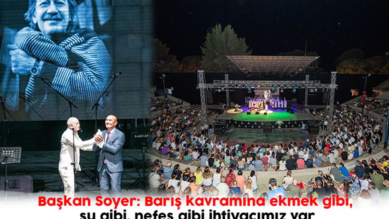 Konserin açılışında konuşan İzmir Büyükşehir Belediye Başkanı Tunç Soyer, “Barış” kavramına ekmek gibi, su gibi, nefes gibi ihtiyaç duyulduğunu, bunun yaşam kaynağı olduğunu söyledi. Barışın, tüm yaşam kaynakları gibi tesadüfen ve kendiliğinden ortaya çıkmadığını ifade eden Başkan Tunç Soyer, “Nasıl ki ekmeğin oluşabilmesi için toprak, yağmur ve tohum gerekiyorsa, barışı mayalamak için de sevgimizi, yetinmeyi ve birbirimize güven duygusunu serpip çoğaltmamız gerekiyor. Bu duygulardan biri dahi eksilse, işte o vakit savaşlar başlıyor. Kendimizle, birbirimizle ve doğamızla, yıkıcı bir savaşa tutuşuyoruz” dedi.