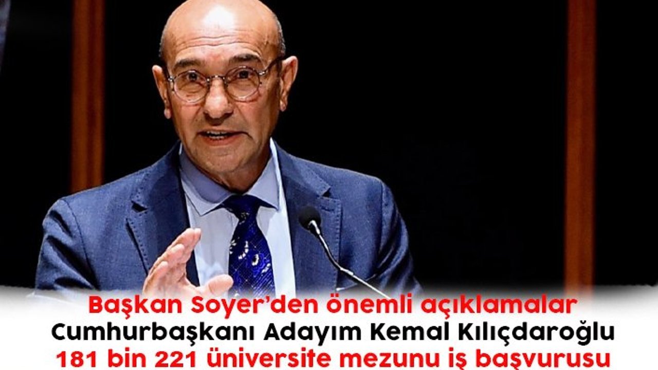 Türkiye’nin büyük bir ekonomik krizin eşiğinden geçtiğini ifade eden İzmir Büyükşehir Belediye Başkanı Tunç Soyer, “İzmirlilerin içi rahat etsin. Onların kılına zarar gelecek, hayatlarını zorlaştıracak bir şeye izin vermeyeceğiz. Bütün önceliğimi derinleşen yoksullukla mücadele. Tüm kaynaklarımızı İzmir’in refahını koruyabilmek için kullanacağız. Bize bugün itibariyle 181 bin 221 üniversite mezunu iş başvurusu. 11 bin 120’si yüksek lisanlı. 658 doktoralı mezun. İşsizlik bu noktada. Feci bir noktada. Feci bir tablo. Büyük bir yoksulluk, işsizliğin, ekonomik krizin eşiğindeyiz. Bizim ülke olarak kaynaklarımız o kadar zengin ki. Biz vatandaşlarımızın bu krizi atlatacak güce sahibiz. Kampanya başlatacağız. Depremde İzmirli yüce gönüllüğünü gösterdi. İzmir’de depremzedelerin 1 ay içinde yaraları sarıldı. Tekrar kampanya yapacağız. Kara kışta vatandaşımızı yalnız bırakmayacağız. İzmirlilerin yüzünü güldürmeye devam edeceğiz” dedi.