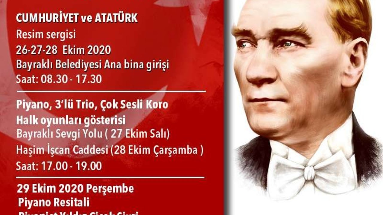 Bayraklı Belediyesi tarafından 'Biz Cumhuriyetiz' sloganıyla düzenlenen etkinlikler kapsamında 26 Ekim Pazartesi, Bayraklı Belediyesi ana hizmet binası girişinde Cumhuriyet ve Atarük konulu resim sergisi açılacak. Belediye kursiyerleri ve Ressamlar Sokağındaki ressamlar tarafından hazırlanan, 40 eserin görücüye çıkacağı 'Cumhuriyet'i Karşılıyoruz' sergisi 26-27-28 Ekim mesai saatleri içinde gezilebilecek.27 Ekim Salı Bayraklı Sevgi Yolunda, 28 Ekim Çarşamba Haşim İşcan Caddesinde sürecek Cumhuriyet Bayramı etkinliklerinde ise 3 kişiden oluşan müzisyenlerin müzik dinletisi, çok sesli koronun konseri ve halk oyunları gösterileri sunulacak.29 Ekim Cumhuriyet Bayramında da saatler 18.00'i gösterdiğinde piyanist Yıldız Çiçek Sivri, soprano Ayşe Şener Özmen eşliğinde piyano resitali verecek. Müzik dinletisi Bayraklı Belediyesi ve TV BEK'in sosyal medya hesaplarından yayınlanacak.