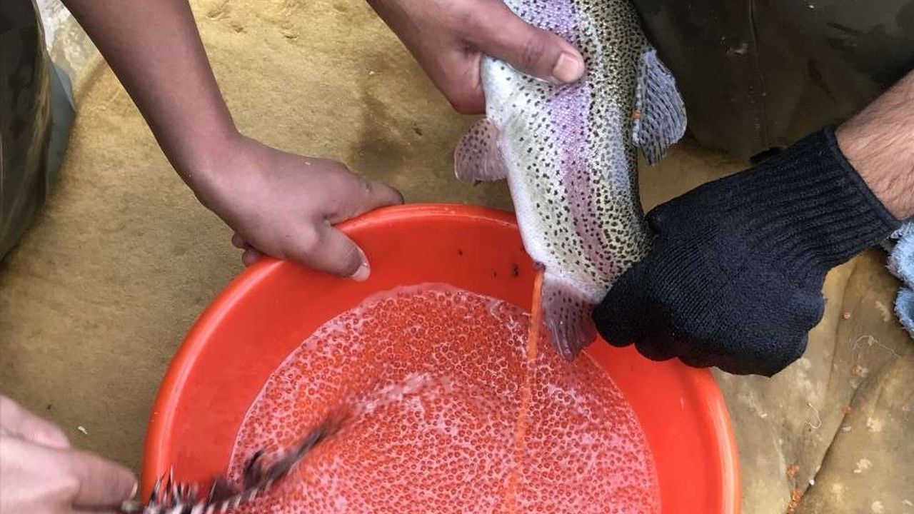 Bir yıl önce beslenip hazırlanan üreme mevsiminde yumurtaları olgunlaşan dişi anaçların, kuluçka ünitesindeki havuzlara alınarak hazırlandığını ifade eden Arslan, 'Sonrasında anaç balıklar el masajı yöntemiyle yumurtaları sağılıyor. Damızlık balıkların da aynı yöntemle spermleri sağılıyor. Geçen yılın Aralık ayı ortalarında başladığımız sağım işlemi ocak ayı sonuna kadar sürecek. Toplamda 3 bin adet anaç ve damızlık alabalığın sağımı yapılacak. Sağımdan sonra dişi balık yumurtalarıyla erkek balık spermleri karıştırılarak bir saatlik bir bekleme sonunda döllenme işlemi tamamlanıyor. Daha sonra 30 günlük kuluçka döneminden sonra yumurtalardan çıkan larvalar 15 gün sonunda yüzmeye başlıyor ve bu yavru balıkların yemlenmesine başlıyoruz' dedi.