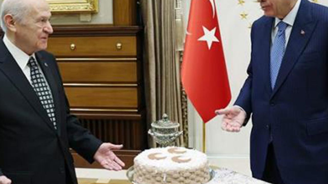 İki lider görüşme sonrasında Devlet Bahçeli'nin doğum tarihi olan 1 Ocak nedeniyle pasta kesti. Pastanın üzerinde 3 hilal bulunması dikkat çekti.