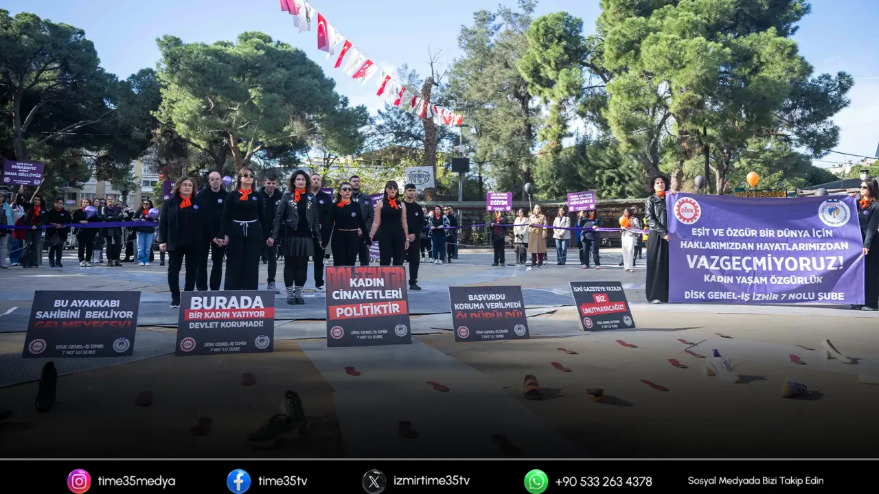 Bornovalı emekçi kadınların 25 Kasım buluşması ise Büyükpark’ta düzenlendi. Etkinlikte DİSK Genel İş 7 No’lu Şube Kadın Komitesi Başkanı Gülistan Tilkici hazırlanan bildiriyi okudu. Kadına yönelik şiddet tiyatral bir sunumla ele alınırken, katılımcılar sloganlar atarak dayanışmanın gücünü ortaya koydu. Program, balonların hep birlikte gökyüzüne bırakılmasıyla simgesel bir mesajla sona erdi.