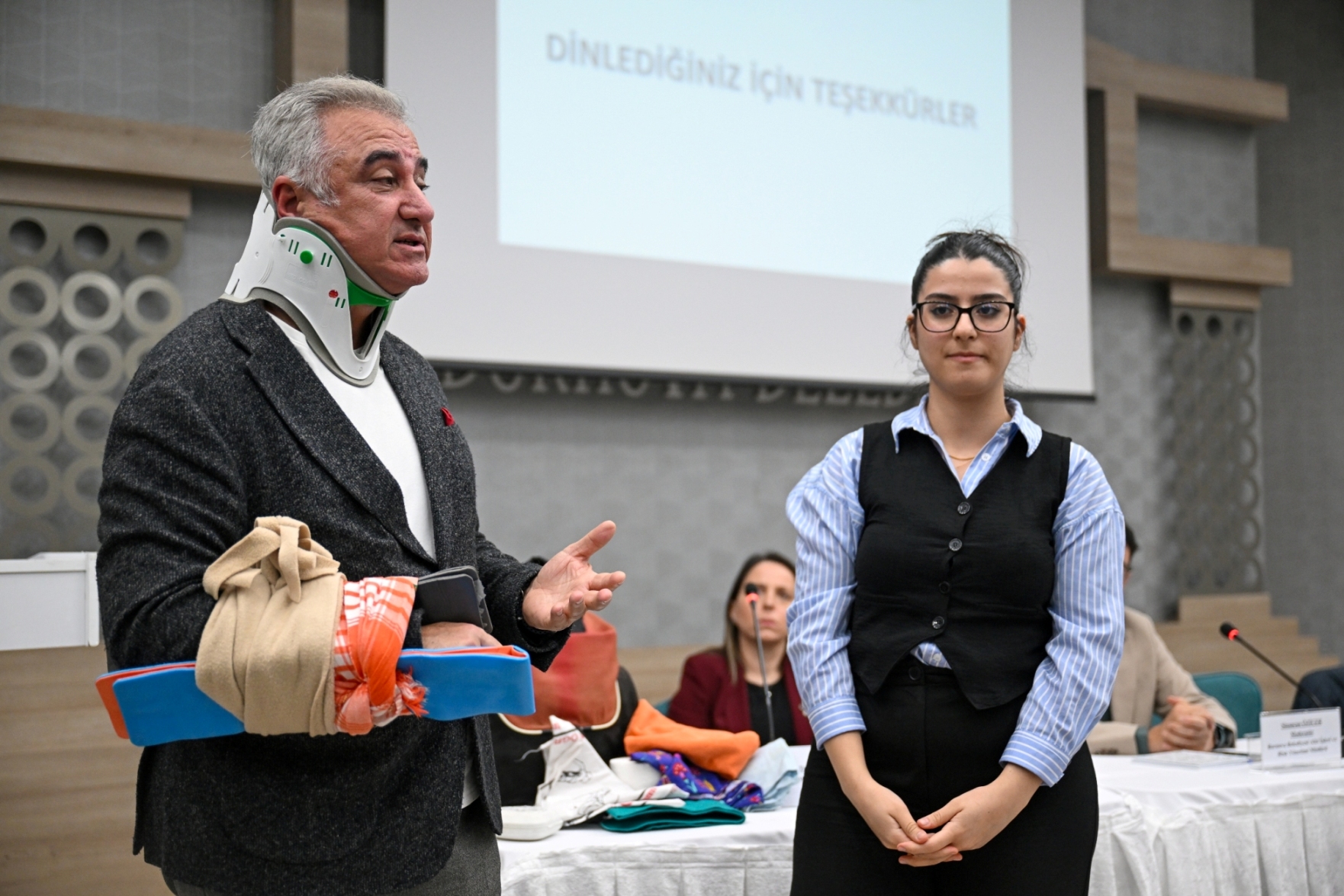 Sunumunda deprem çantasının önemini vurgulayan Rodoplu, kırık, çıkık ve kanamalarda yapılması gerekenleri uygulamalı olarak göstererek,“Deprem çantasında özellikle kanamayı durdurmaya yönelik malzemeler mutlaka bulunmalı.” ifadelerini kullandı.