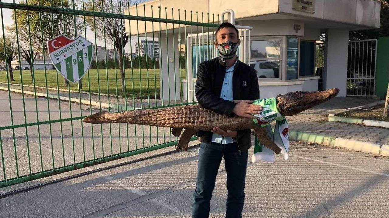 TFF 1. Lig ekiplerinden Bursaspor, Eskişehirspor maçı hazırlıklarına devam ederken, tesislerin dışında ilginç bir görüntü dikkat çekti. Yeşil-beyazlı bir taraftar, Sudan’dan aldığı doldurulmuş gerçek bir timsaha atkı takarak, Özlüce İbrahim Yazıcı Tesisleri’nin yolunu tuttu. Pandemi sebebiyle içeriye alınmayan taraftar, Bursaspor’un simgesi olan timsahı ve yeşil-beyazlı takıma olan sevgisini şu sözlerle anlattı: