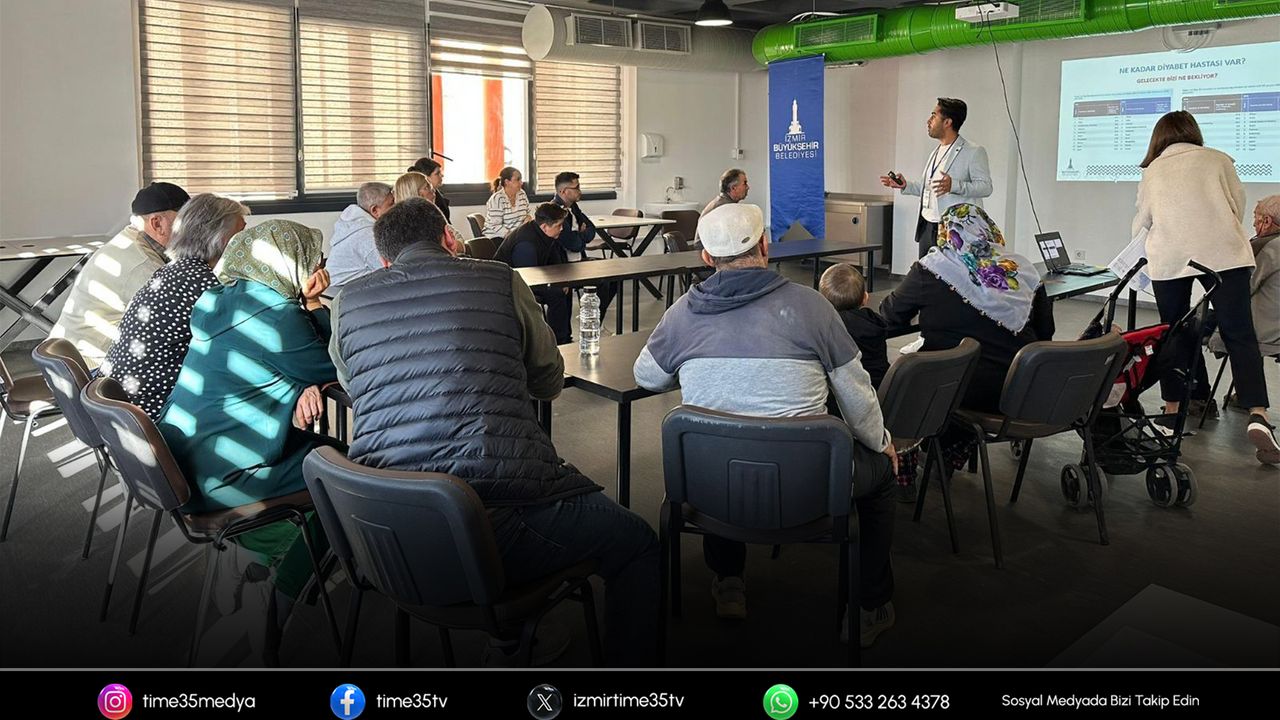 İZSEM’de düzenlenen eğitimde ise Sağlık Eğitimleri Şube Müdürlüğü’nde görevli Diyetisyen Emre Turhan, diyabet farkındalığını artırmak ve diyabet eğitimini yaygınlaştırmak için köy köy, mahalle mahalle diyabet farkındalığı eğitimleri düzenlediklerini belirtti. Turhan, “Bu eğitimlerde diyabetin nasıl bir hastalık olduğu, diyabette beslenme, fiziksel aktivite ve öz bakımın önemini anlatıyoruz. Şeker hastalarının en büyük korkularından birisi de ‘yediklerimiz kan şekerimi yükseltir mi?’ korkusudur. Bu noktada diyabet hastalarının özellikle karbonhidratlardan korkmamaları gerekir. Burada önemli olan kan şekerini yavaş yükselten kompleks karbonhidratları tüketmektir. Kompleks karbonhidratlar tam tahıllar, kuru baklagiller, sebzeler ve meyvelerde bulunur. Yüksek şeker zarar verir, düşük şeker öldürür. Bu nedenle şeker hastalarının hipoglisemi tehlikesine karşın mutlaka yanlarında kan şekerini hızlı artıracak karbonhidratları taşımaları ve ara öğün yapmaları çok önemlidir. Yine kan şekeri ölçümü yapmak hayat kurtarır. Beslenmenin düzenlenmesi için bir diyabet diyetisyenine gidilmesinin yanı sıra hekimin verdiği ilaçları düzenli kullanmak ve düzenli hekim kontrolüne gitmek de çok önemlidir” dedi.
