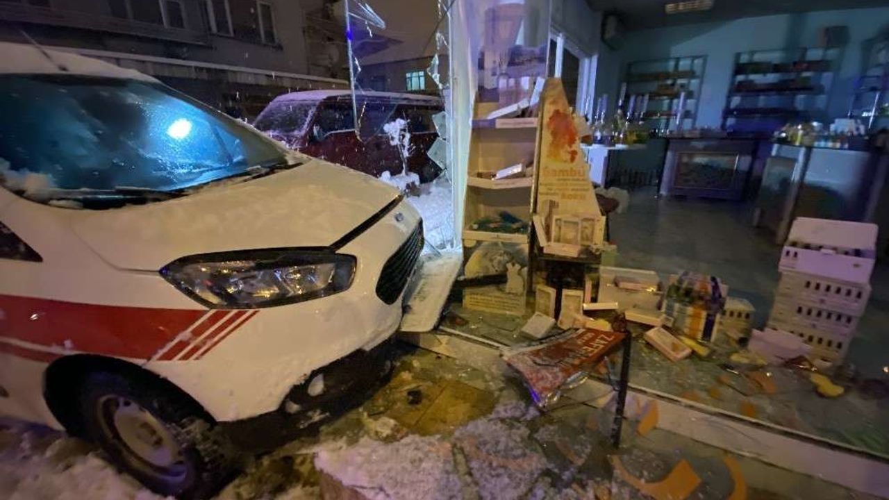 Buz pistine dönen caddede kayan hafif ticari araç, kolonya dükkanına girdi