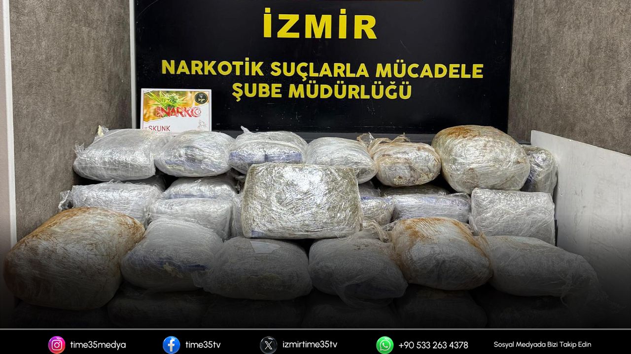Çeşme Cumhuriyet Başsavcılığı koordinesindeki Narkotik Suçlarla Mücadele Şube Müdürlüğü ekipleri, uyuşturucu veya uyarıcı madde ticareti yapan zehir tacirlerine yönelik çalışma yaptı. Bu kapsamda önceki gün Çeşme ilçesinde durdurulan bir otomobilde arama yapıldı. Aramada 65 kilo 367 gram skunk ele geçirildi. H.B. adlı şüpheli gözaltına alındı. Emniyetteki işlemleri tamamlandıktan sonra adliyeye sevk edilen H.B. çıkarıldığı mahkeme tarafından tutuklandı.