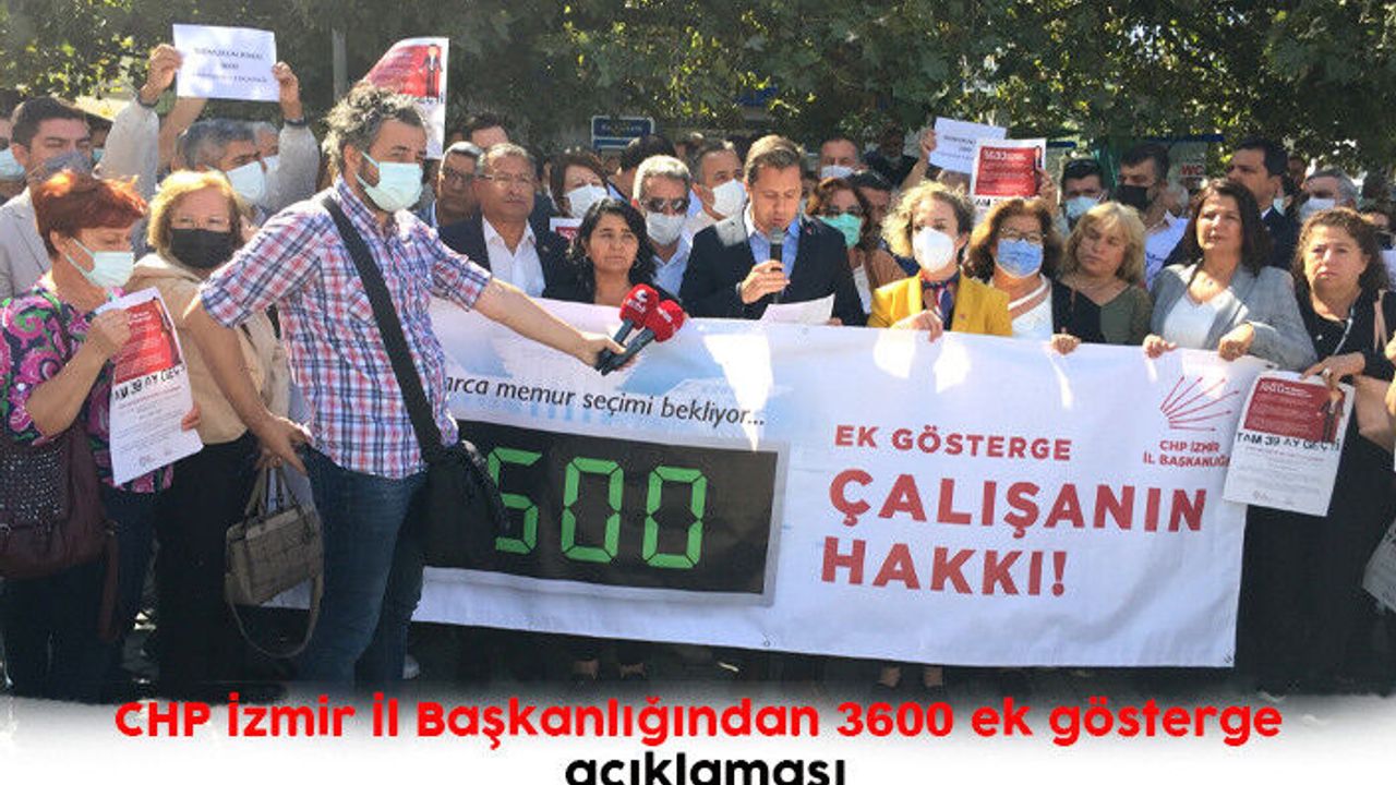 Cumhuriyet Halk Partisi İzmir İl Başkanlığı, AKP iktidarı ve Cumhurbaşkanı Recep Tayyip Erdoğan tarafından, 39 ay önce söz verilmesine rağmen, Memurlara verilmeyen 3600 ek gösterge hakkı için, İzmir Konak Meydanında Basın açıklaması düzenledi. 81 ilde eş zamanlı olarak gerçekleştirilen basın açıklamasını, CHP İzmir İl Başkanı Deniz Yücel yaptı.