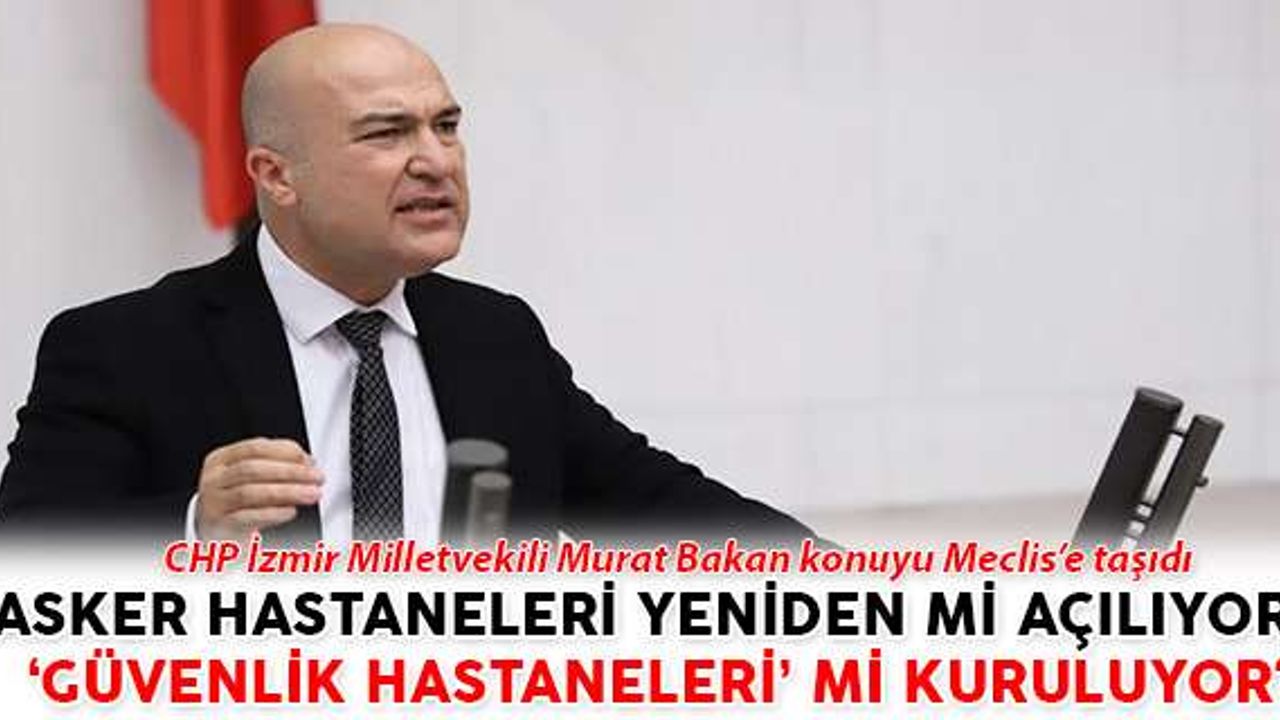 Asker hastanelerinin yeniden açılacağı gündeme geldi. CHP İzmir Milletvekili Murat Bakan konuyu Meclis gündemine taşıdı, Asker Hastaneleri'nin tekrar açılması için yürütülen çalışmanın detaylarını sordu. CHP'li Bakan, Asker Hastaneleri'nin açılmayıp Sağlık Bakanlığı çatısı altında 'Güvenlik Hastaneleri' kurulacağı iddiasını da sordu.