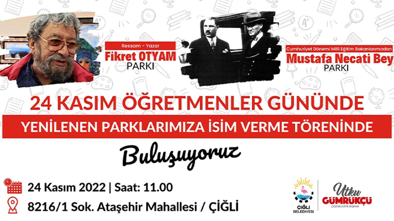 Ataşehir Mahallesi’nde yer alan parklara Cumhuriyet dönemi Milli Eğitim Bakanlarından Mustafa Necati Bey ve fotoğrafçı-yazar Fikret Otyam’ın isimleri verilecek. 24 Kasım Perşembe günü düzenlenecek tören saat 11:00’de başlayacak ve halka açık olacak.