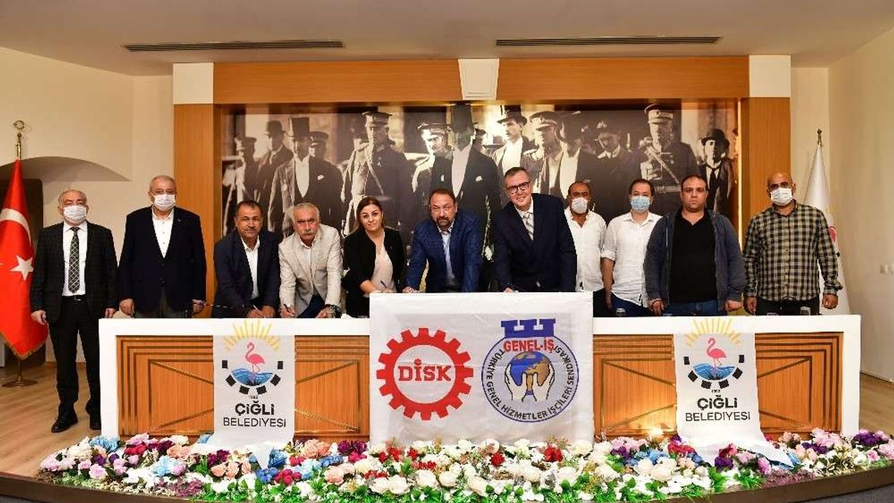 Çiğli Belediyesinin kadrolu işçilerini ilgilendiren Toplu İş Sözleşmesi (TİS), Çiğli Belediye Başkanı Utku Gümrükçü, Genel-İş Sendikası Genel Sekreteri Şükret Sevgener, DİSK Ege Bölge Temsilcisi Memiş Sarı, Genel-İş Sendikası 8 Nolu Şube Başkanı Deniz Şahin Gümüştekin tarafından belediye meclis salonunda düzenlenen törenle imzalandı. Sözleşmeye göre, kadrolu işçilerin ücretlerinde yüzde 14 oranında artış sağlandı.