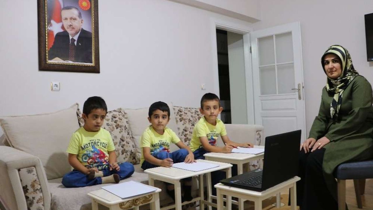 Anne Dilek Akıncı, küçük bir sınıf ortamı oluşturduklarını belirterek, “2014 yılında üçüz doğum yaptım. Çocuklarımız erkek olunca reisin adını vermek istedik. Adıyla yaşasınlar inşallah. Onun gibi vatana millete hayırlı olsunlar. Temennimiz o yönde. Down sendromlular gününe gitmiştik. Tayyip down sendromlu. Davet etti. Külliye’de misafiri olduk. Diğer down sendromlu çocukları gördük. Onların neler başarabildiğini de gördük. Okula başladık. Pandemi sürecinden dolayı eski okul sürecimiz yok. Ama uzaktan eğitim olarak devam ediyoruz. EBA’dan giriyoruz, bilgisayarlardan internetten giriyoruz. Çocuklarımızın eğitimine devam ediyoruz. Eğitimden asla çocuklarımızı geri bırakmıyoruz. Üç çocuk aynı anda ders yapmak zorunda kalıyor. Bir küçük sınıf ortamı oldu. Söz dinletmekte zor oluyor ama yine de yapmak zorundayız veli olarak. Öğreteceğimiz ilk şey Recep Tayyip Erdoğan’ın ismi olacak. Yazdıracağım ilk şey de o olacak. İnşallah yazdıkları zaman onu da bir hatıra olarak ilk kelimeleri olarak çerçeveletip asmak istiyorum. Hatta fırsat olursa da reisimize hediye etmek istiyoruz’’ şeklinde konuştu.