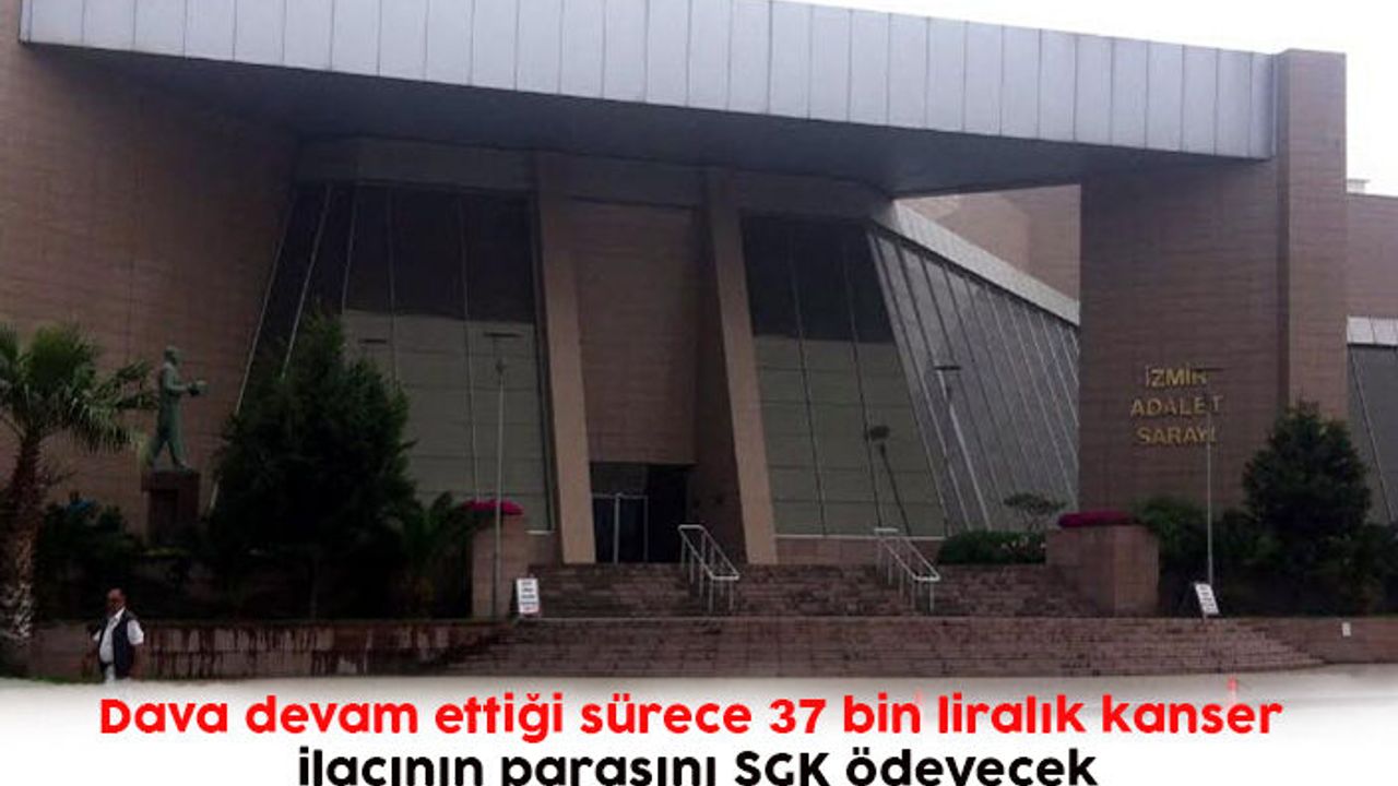 İzmir'de yaşayan ve akciğer kanseri olan E.K., SGK tarafından ilaç masrafları ödenmediği için İzmir 16'ncı İş Mahkemesi'ne başvurup, yaklaşık 37 bin lira olan ilaç bedelini SGK'nın karşılamasını talep etti. Mahkeme, K.E.'nin yaşam hakkı kapsamında, ilacı, dava devam ettiği sürece bedelsiz olarak almasına hükmetti.