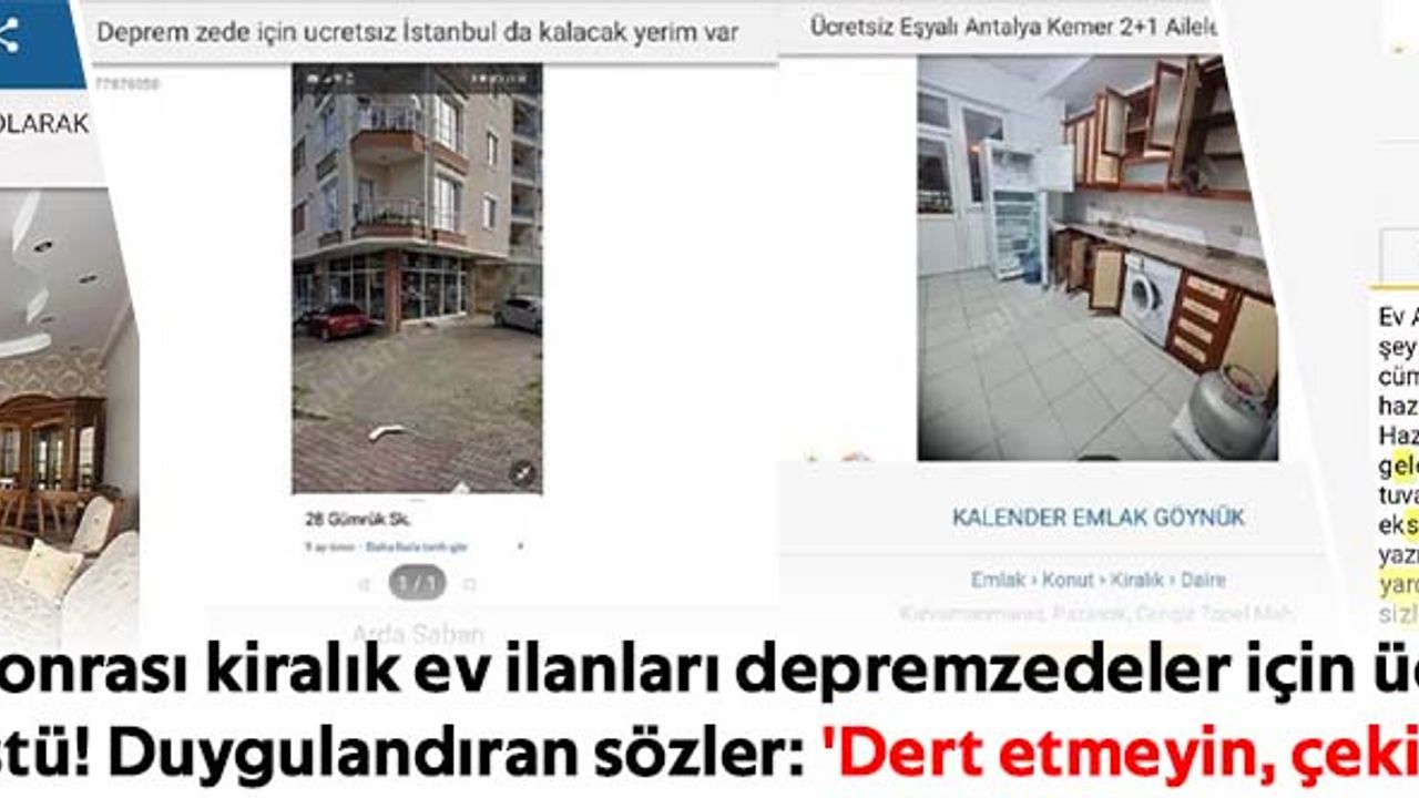 Kiralık ev ilanlarının yayınlandığı birçok internet sitesinde, ev sahipleri 'Kiralık' olan ilanlarını, 'Depremzedeler için ücretsizdir' şeklinde değiştirdi. İlanların yayınlandığı internet sitelerinde yüzlerce ilanda depremzedeler için ücretsiz olduğu belirtilirken, bazı ev sahipleri kendi yaşadıkları evler için bile depremzedeler için oda ayırabileceklerine yönelik ilanlar vermeye başladı.