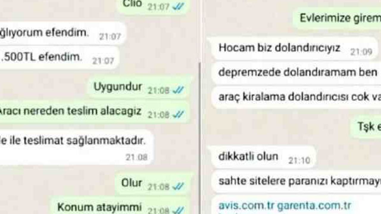 Dolandırıcı, depremzedeyle olan mesajlaşmalarında 'Ben depremzede dolandıramam. Araç kiralama dolandırıcısı çok var. Dikkatli olun. Sahte sitelere paranızı kaptırmayın.' diyerek uyardı.