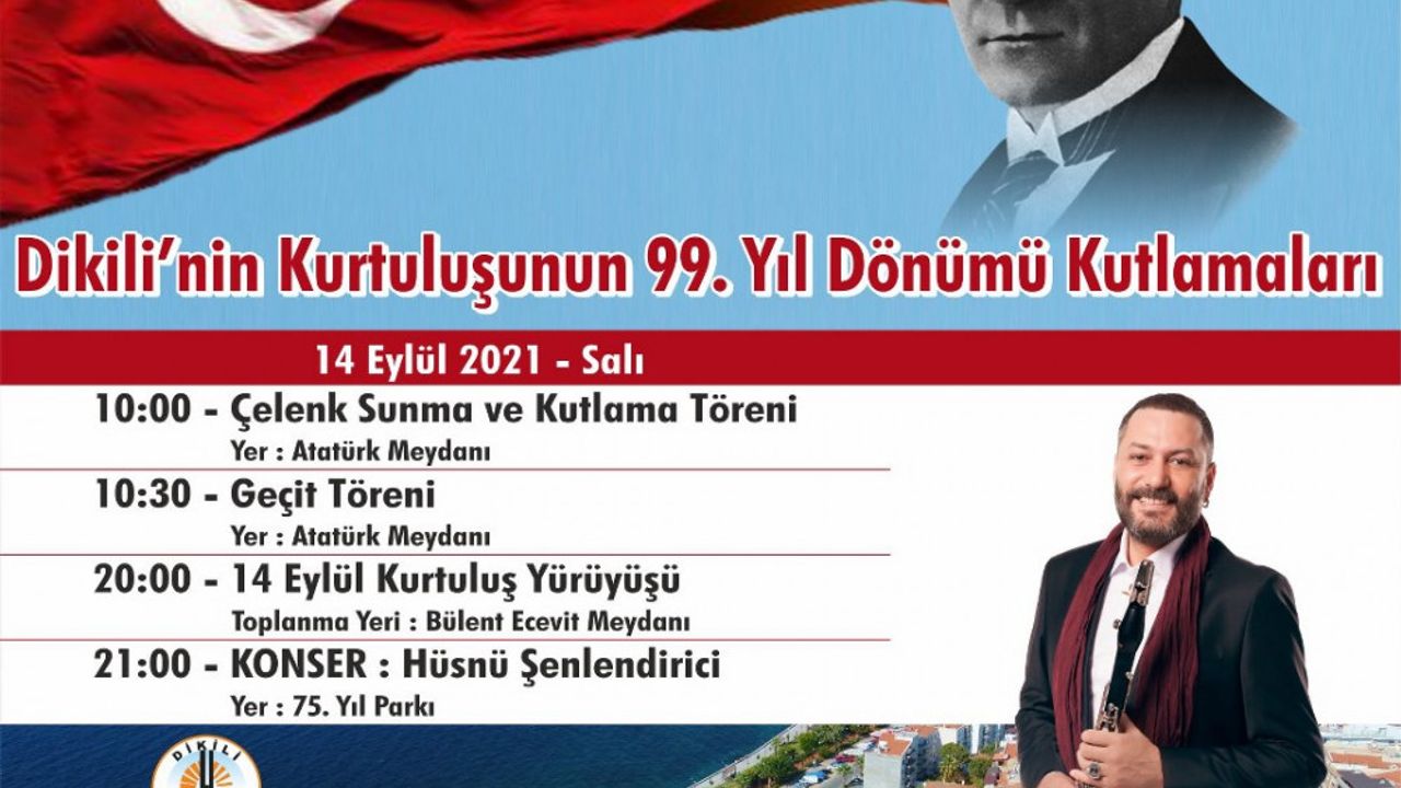 Program saat 10.00’da Atatürk Meydanı’nda Atatürk Anıtı’na çelenk sunumuyla başlayacak. Ardından geçit töreni gerçekleşecek. Saat 20.00’de ise Bülent Ecevit Meydanı’nda Dikilili vatandaşların katılımıyla “14 Eylül Kurtuluş Yürüyüşü” başlayacak. 75. Yıl Park’ında son bulacak yürüyüş sonrası saat 21.00’de de ünlü klarnet ustası Hüsnü Şenlendirici sahne alacak.