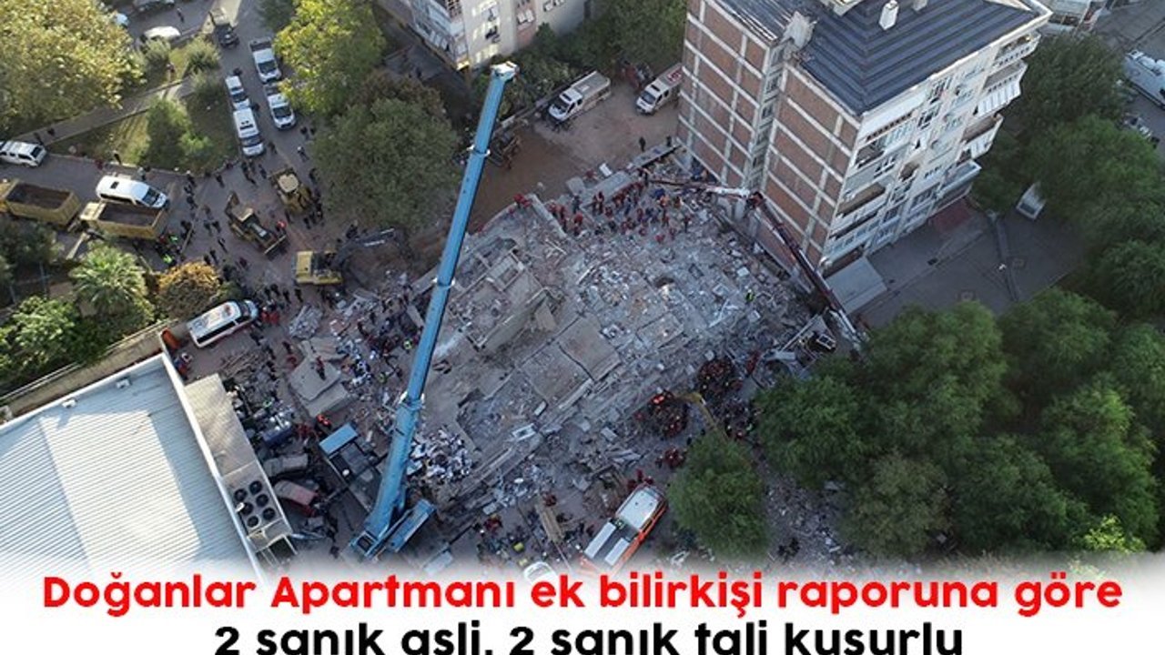 İzmir'de, 30 Ekim 2020'de meydana gelen depremde, 15 kişinin öldüğü 12 kişinin de yaralandığı Doğanlar Apartmanı ile ilgili davada 2'si tutuklu, 4 sanığın 'bilinçli taksirle birden fazla kişinin ölümüne ve yaralanmasına sebep olmak' suçundan yargılanmalarına devam edildi. Celsede okunan ek bilirkişi raporunda müteahhit Çetin Doğan ve fenni mesul firari Bedriye Işıldak asli, yapı sürveyanı Gündüz Uysal ve statik betonarme proje müellifi Mehmet Sedat Boyacı'nın tali kusurlu olduğu belirtildi.