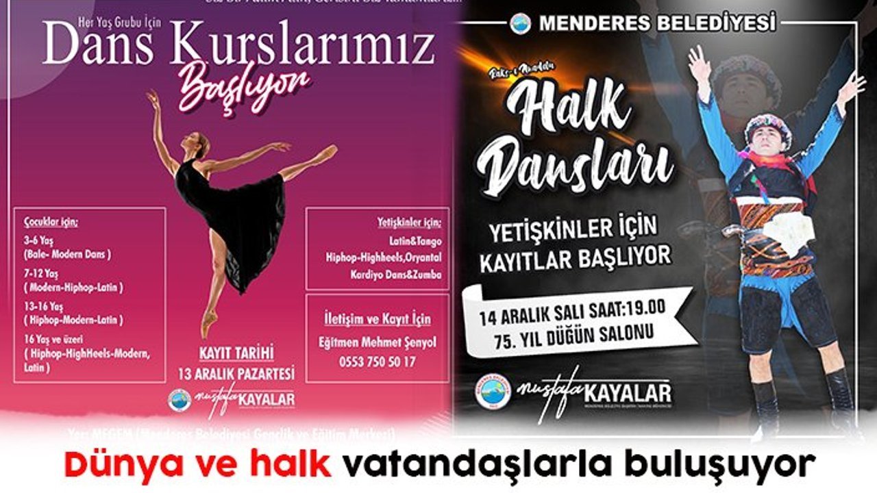 Menderes Belediyesi tarafından dünya dansları ve halk dansları kursları başlatılıyor. Kurslara katılmak isteyen vatandaşlar dünya dansları için 13 Aralık Pazartesi günü Menderes Belediyesi Gençlik ve Eğitim Merkezi’nde, halk dansları için 14 Aralık Salı günü 75. Yıl Düğün Salonu’nda kayıt yaptırabilecek.