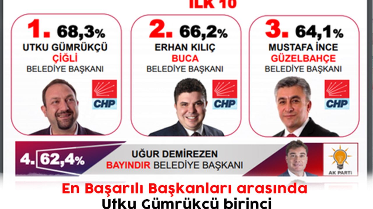 İzmir'de ise ilk sırada yüzde 68.3 ile CHP'li Çiğli Belediye Başkanı Utku Gümrükçü olurken, ikinci sırayı yüzde 66.2 ile CHP'li Buca Belediye Başkanı Erhan Kılıç aldı.
