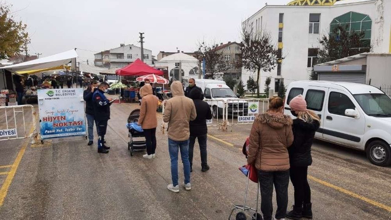 Ergene ilçesinde Yeşiltepe, Sağlık, Velimeşe mahalleleri başta olmak üzere ilçenin semt pazarı kurulan tüm mahallelerinde denetim yapan Ergene Belediyesi Zabıta Müdürlüğü ekipleri semt pazarlarının giriş ve çıkışlarında kontrol noktaları oluşturarak pazar alanına giriş ve çıkışları denetim altında tutarak alışverişe gelen vatandaşların HES kodu sorgulamalarını yapıyor.