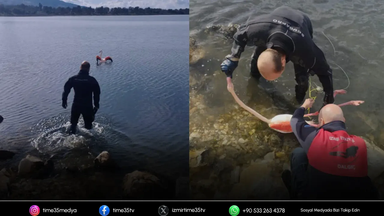 İzmir’in Balçova ilçesindeki İnciraltı Kent Ormanı’nda, vücuduna ip dolanan flamingo, İzmir İtfaiyesi dalgıçlarının yaklaşık 15 dakikalık müdahalesiyle kurtarılarak doğal yaşam alanına salındı.