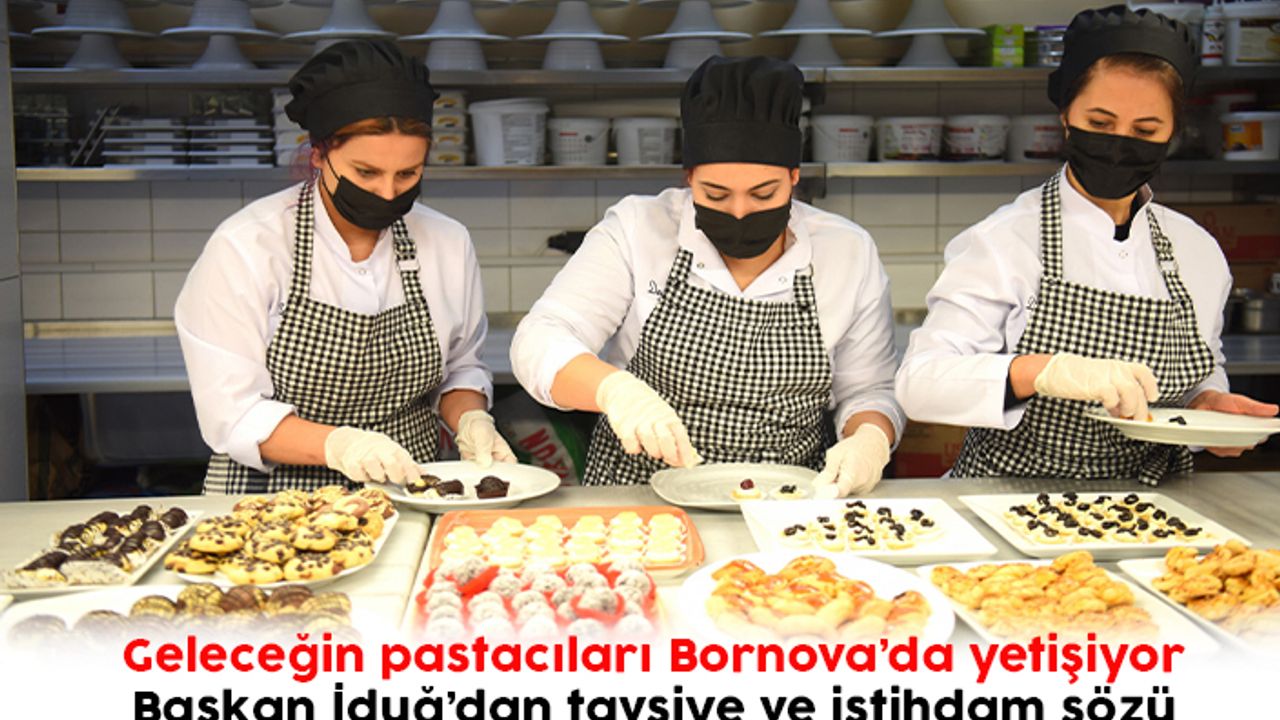 Bornova Belediye Başkanı Dr. Mustafa İduğ, EVKA-3’te Mutfak Atölyesi’nde İzmir Şekerciler ve Pastacılar Odası işbirliğinde düzenlenen pastacılık kursuna katılan kursiyerleri ziyaret etti. İduğ, 3.5 ay sürecek eğitimin sonunda uluslararası geçerliliğe sahip kalfalık belgesini alacak olan katılımcıların yaptığı pastayı kesti.