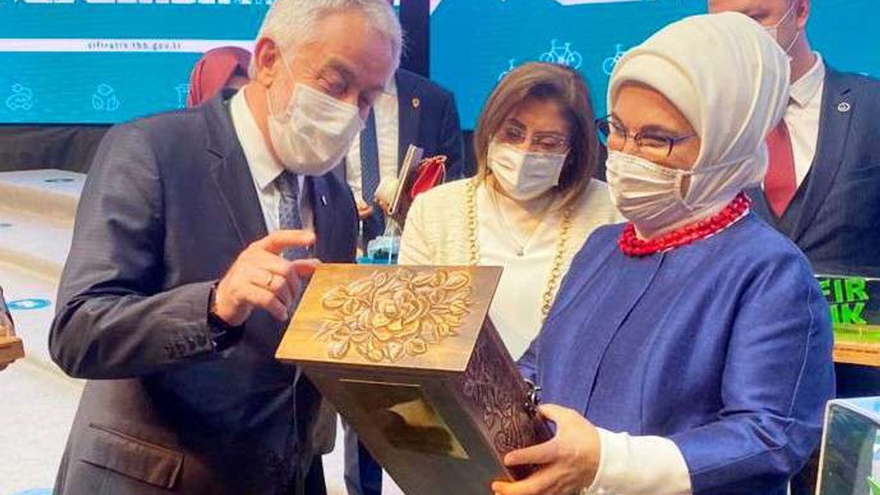 Belediye Başkanı Şükrü Başdeğirmen, hediyenin hazırlanışına ilişkin Emine Erdoğan’a bilgiler sundu. Başkan Başdeğirmen, “Şahsınızın başlatmış olduğu sıfır atık projesi ülkemizde önemli bir farkındalık hareketi olmuş ve sizinle özdeşleşmiştir” dedi.