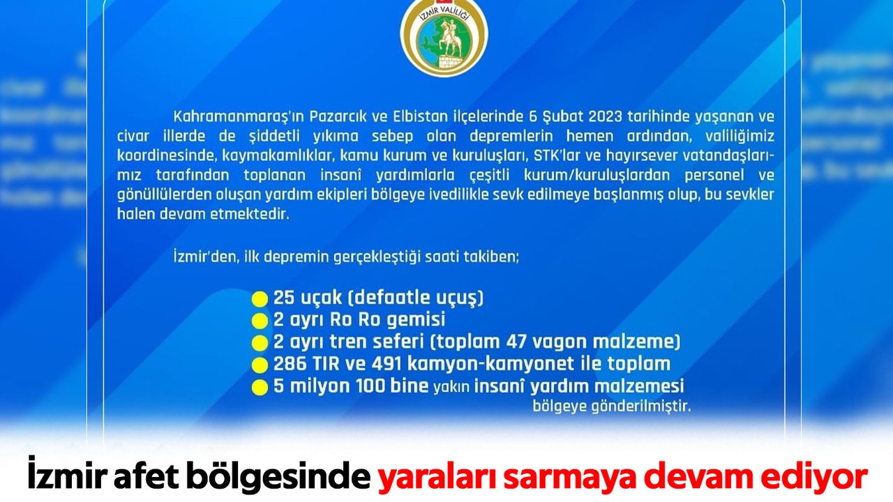 İzmir Valisi Yavuz Selim Köşger, yaptığı yazılı açıklamada, Kahramanmaraş’ın Pazarcık ve Elbistan ilçelerinde 6 Şubat 2023 tarihinde yaşanan ve civar illerde şiddetli yıkıma sebep olan depremlerin hemen ardından toplanan insani yardımlarla çeşitli kurum/kuruluşlardan personel ve gönüllülerden oluşan yardım ekiplerinin bölgeye ivedilikle sevk edildiğini ve bu sevklerin halen devam ettiğini belirtti.