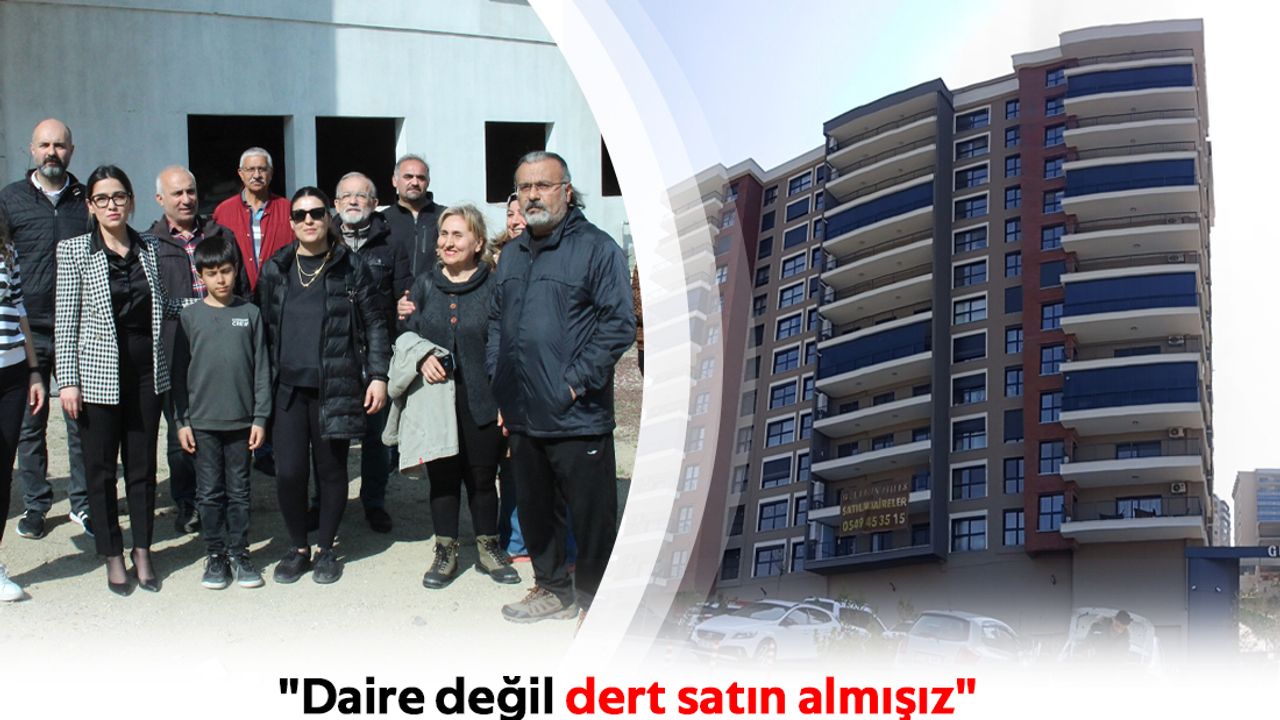 Mağdurlardan Erol Güneş ise, Projenin maketinden bakarak buradan daire satın aldık. İzmir'in en tanınmış inşaat firmasının arsa sahibi olması ve ortaklığının bulunması nedeniyle kendilerine güvenerek 1028 yılında dairemizi aldık. Hala dairelerimize kavuşmuş değiliz. Sözleşmeye 2019 Haziran'da teslim edilmesi gerekiyordu. Ortalama 70-80 aile mağdur durumda burada ve o zamanın parasıyla 90 bin ila 100 bin dolar arasında bir ücret ödedik. Şu anda buradaki daire fiyatlarına baktığımızda mağduriyetimiz 2 milyon 500 bin lira civarında. Biz de mağdurlar olarak aramızda iletişimi sağlamak için bir iletişim grubu oluşturduk. Buraya geldikçe tanıştık, bir araya geldik ve hukuksal mücadelelere giriştik. Biz bu firmaya güvenerek bir daire satın aldık sanıyorduk ama paramızı verip daire değil dert satın almışız. Evlerimize bir an önce kavuşmak istiyoruz" diye konuştu.