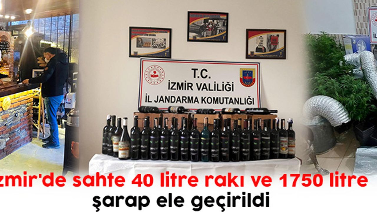İzmir'de, jandarma ekiplerince 9 ilçede eş zamanlı gerçekleştirilen operasyonda; sahte olduğu belirlenen 40 litre rakı ve 1750 litre şarap ile alkol yapımında kullanılan 26 aroma ele geçirildi.