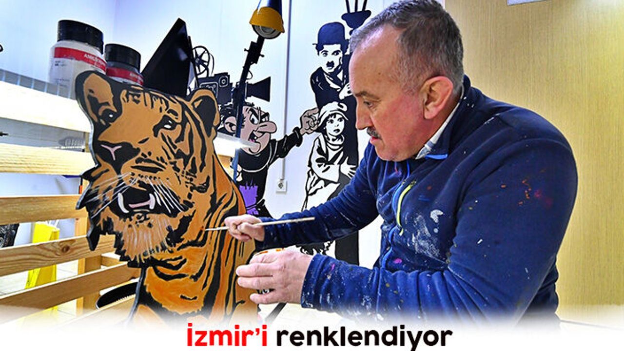 Boya ustası olarak çalışan 49 yaşındaki 2 çocuk babası Murat Ülkü, İzmir’in her köşesine çizgi film kahramanlarını, halk ozanlarını, Yeşilçam filmlerinin unutulmaz isimlerini resmediyor.