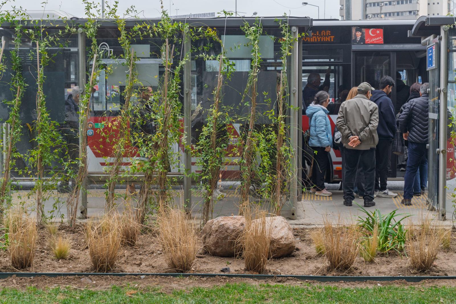 İzmir Büyükşehir Belediyesi, kamusal alanlarda yaptığı estetik dokunuşlarla kentin çehresini değiştirmeye otobüs duraklarıyla devam ediyor. Yeşil Durak projesi kapsamında durakların üstü sarmaşıklarla donatılırken, durak çevresi ise az su tüketen bitkilerle düzenleniyor.