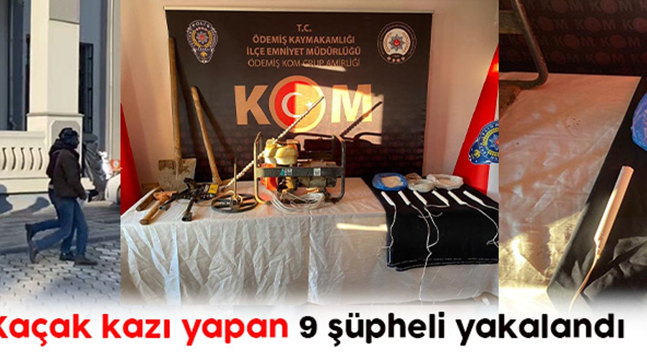 Ödemiş İlçe Emniyet Müdürlüğü Kaçakçılık ve Organize Suçlarla Mücadele Şube Müdürlüğü (KOM) ekipleri, kırsal alanda kaçak kazı yapıldığı ihbarını aldı. Harekete geçen ekipler kırsal alanda F.A., L.Ç., M.Ö., M.T., E.A., R.A., T.A., A.D. ve T.Y.'yi kaçak kazı yaparken suçüstü yakaladı. Bölgede yapılan aramada 1 el jeneratörü, 1 el dedektörü ve kazı çalışmalarında kullanılan kazma, kürek, çekiç ve balyoz ele geçirildi. Gözaltına alınan şüphelilerin emniyetteki işlemleri sürüyor.