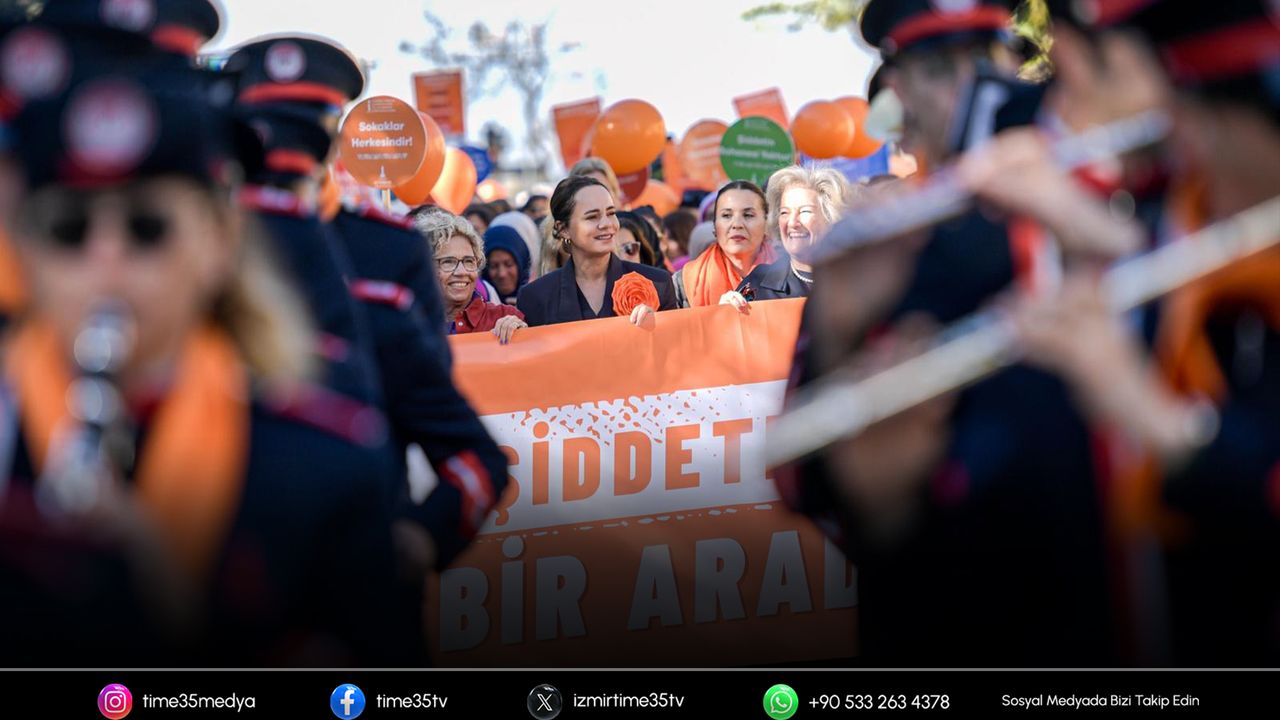 25 Kasım Kadına Yönelik Şiddete Karşı Uluslararası Mücadele Günü kapsamında İzmir Büyükşehir Belediyesi tarafından “Şiddete Karşı Bir Aradayız” ve “Birlikte Güçleniyoruz: Şiddetsiz Bir Kent İçin Kadın Dayanışması” temalarıyla düzenlenen etkinlikler “Eşitliğe Yürüyoruz” Farkındalık Yürüyüşü ile devam etti. “Şiddete karşı Bir Aradayız” pankartıyla başlayan yürüyüşe İzmir Büyükşehir Belediye Başkanı Dr. Cemil Tugay’ın eşi Öznur Tugay, kadın sivil toplum kuruluşları ve derneklerinin başkanları ile temsilcileri, İzmir Büyükşehir Belediyesi bürokratları ve vatandaşlar katıldı.