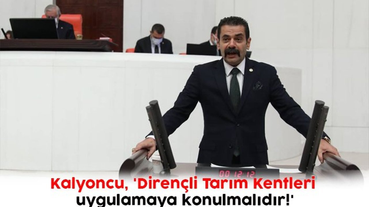 TBMM Genel Kurulunda Tarım ve Orman Bakanlığı’nın 2022 yılı bütçesi üzerinde söz alan MHP İzmir Milletvekili Prof. Dr. Hasan Kalyoncu Milli Tarım hamlesine dikkat çekerek "tarım işbirliğini sağlamalı, tarımda Turan'ı gerçekleştirmeliyiz" dedi. Çevre başta olmak üzere, iklim değişikliği ve tarım hamlesi konularına değinen Kalyoncu, MHP’nin 1969’dan Beri Önerdiği Dirençli Tarım Kentleri İklim Değişikliği Etkilerine Çare olacağını dirençli Tarım kentlerinin bir an önce uygulamaya konulması gerektiğini ifade etti.
