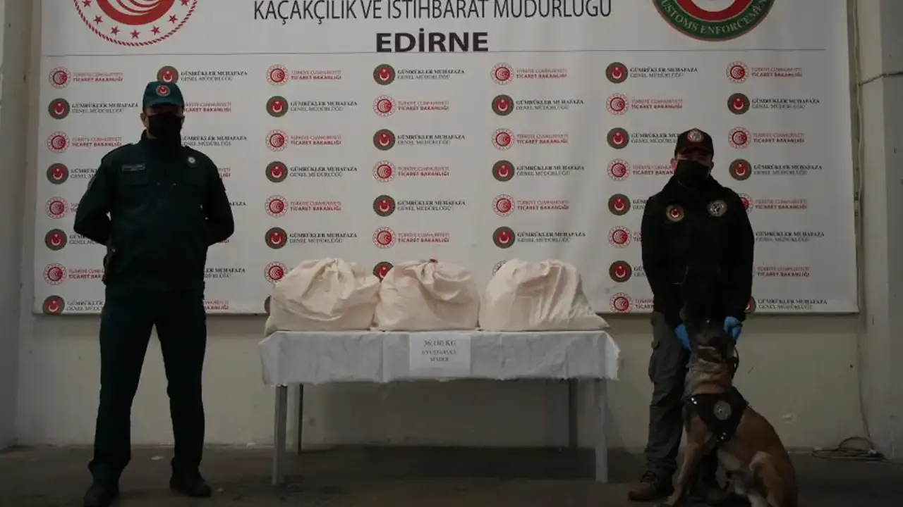 Edirne Kapıkule Gümrük Muhafaza ekipleri yurda giriş yapmak üzere gümrük sahasına gelen kapalı kasa kamyoneti risk analizleri için X-Ray taramasına sevk etti. Araçta şüpheli yoğunluk tespiti üzerine narkotik köpeği "Alfa" ile yapılan detaylı aramada, sürücü ve ön yolcu koltuğu arkasındaki döşemedeki gizli bölmede, çok sayıda şeffaf vakumlu poşette 36 kilo 180 gram kokain ele geçirildi.