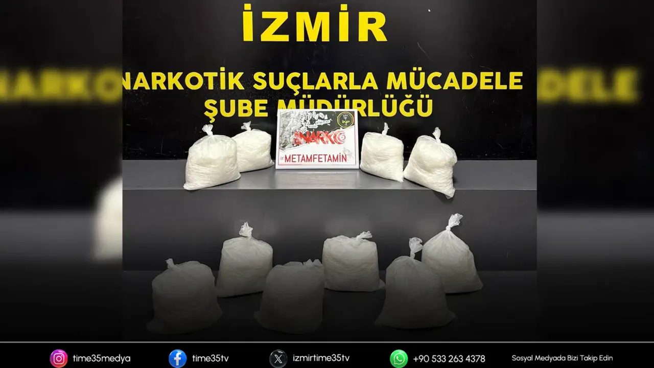 İzmir'de bir kargo firmasına gönderilen pakette 9 kilo 620 gram metamfetamin ele geçirilirken, 2 şüpheli gözaltına alındı.