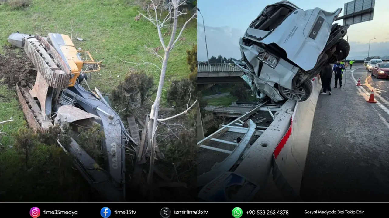 Kaza, saat 17.30 sıralarında Konak ilçesi Homeros Bulvarı'nda meydana geldi. Murat Şimşek (49) idaresindeki 42 AFV 856 plakalı iş makinesi yüklü TIR, iddiaya göre freni boşalması sonucu aynı yönde seyrede İsa Berk Kasap (23) yönetimindeki 35 DBK 20 plakalı hafif ticari araca çarpıp, kontrolden çıkarak viyadükten düştü. Hafif ticari araç ise viyadüğü bariyerlerinde asılı kaldı. Çevredekilerin ihbarı üzerine kaza yerine sağlık, itfaiye ve polis ekipleri sevk edildi. Hafif ticari araçta sıkışan sürücü Kasap ve yolcu konumundaki Bahaddin Erden (19) ile TIR şoförü Şimşek, itfaiye ekipleri tarafından bulundukları yerden çıkarıldı. Ambulanslarla hastaneye kaldırılan 3 yaralıdan Erden ve Şimşek'in hayati tehlikelerinin bulunduğu öğrenildi. Kaza sebebiyle trafik kontrollü olarak sağlanırken, araçların çekilmesiyle ulaşım yeniden normale döndü.