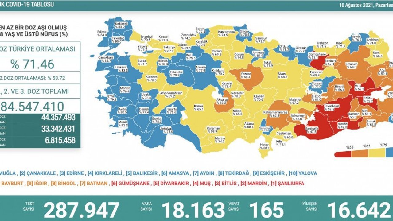 Sağlık Bakanlığı'nın açıkladığı 'Günlük Kovid- 19 Tablosu' verilerine göre; son 24 saatte yapılan 287 bin 947 testte 18 bin 163 vaka tespit edildi. Koronavirüs nedeniyle 165 kişi hayatını kaybederken, 16 bin 642 kişinin de tedavisi ve karantinası sona erdi.